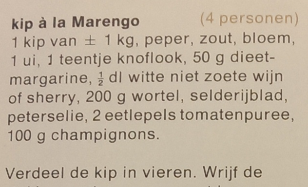 Uiteraard is dit recept door het Voorlichtingsbureau aangepast aan de dieetwensen van de jaren zeventig. Zo werd de cognac vervangen door witte wijn (of sherry!) en u gaat mij niet vertellen dat Napoleon ooit een hap dieetmargarine heeft gehad. Ook ik heb het recept iets aangepast. In plaats van een hele kip in vieren te hakken, heb ik twee kippenbouten aangeschaft. Onderstaand recept is dus voor twee personen, niet voor vier.