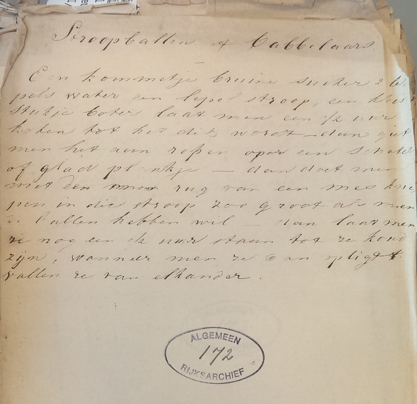 De Archiefkok vond dit recept voor babbelaars in de enorme receptenverzameling van Petronella Wilhelmina Heyligers . Geen Zeeuwse, zoals u misschien zou vermoeden, maar geboren in 1783 in Deventer. Ze noemt deze snoepjes ook geen babbelaars, maar siroopballen. En in die naam zit het subtiele verschil tussen Zeeuwse boterbabbelaars en Petronella’s siroopballen: een lepeltje stroop.