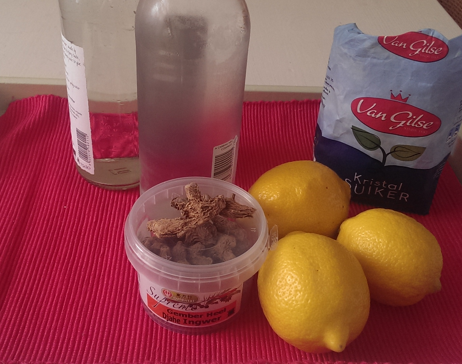 Dit recept lijkt simpel maar geeft toch een hoop hoofdbrekens. Ten eerste willen wij natuurlijk geen 28 flessen maken. Ten tweede hebben we kruiken nodig (en nee, niet van het soort dat u ’s winters mee naar bed neemt, tenzij u daar stiekem drinkt). Ten derde staat de helft van de ingrediënten in geld uitgedrukt. Voor twintig cent gedroogde gember en voor een cent gist.