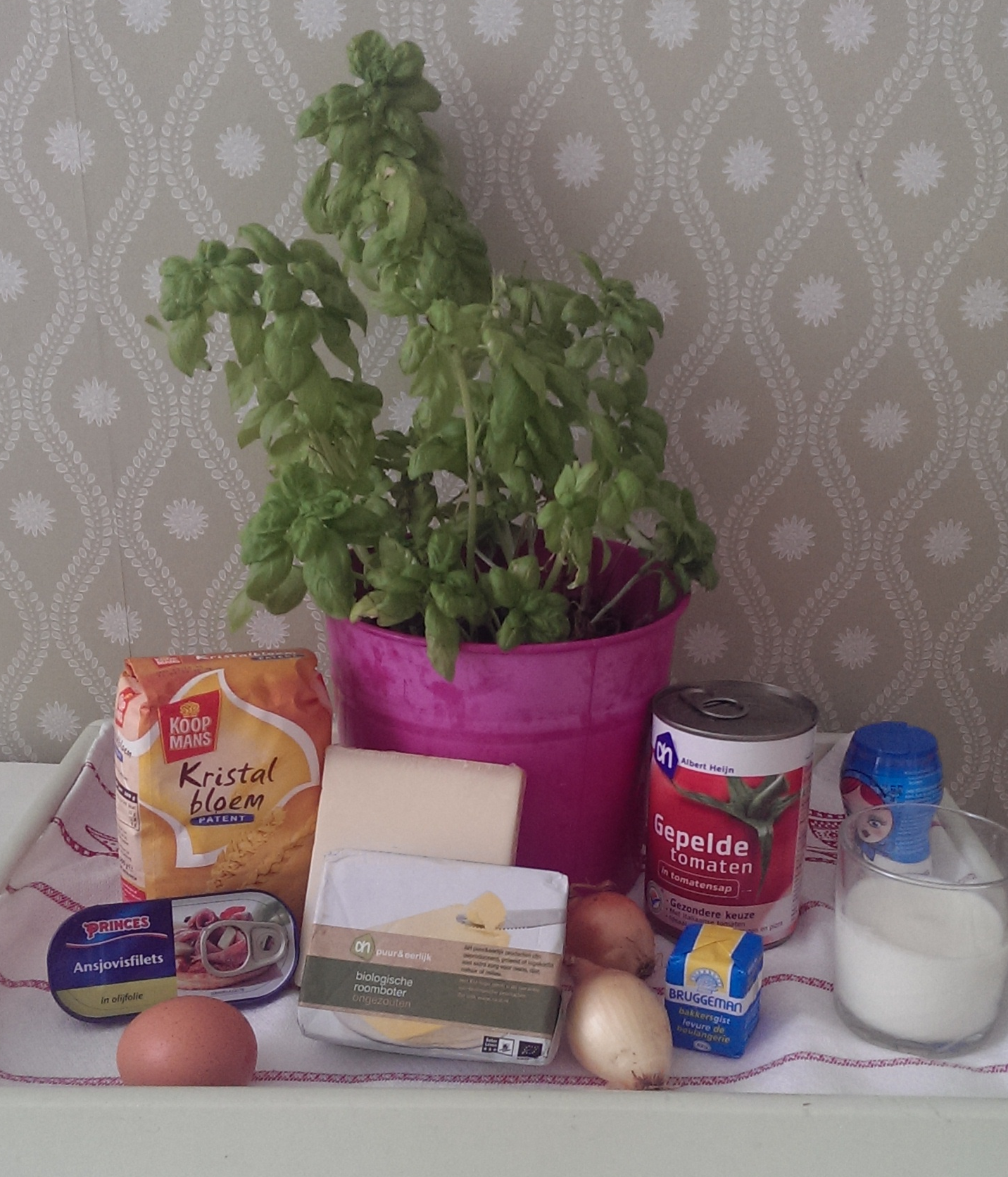 Versie 1:een blik gepelde tomaten (of een kilo verse zonder vel of zaden), 200 gram gruyere in plakken, 3 eetlepels olie, 6 anjovisfilets, zout, peper en basilicum of oregano.
