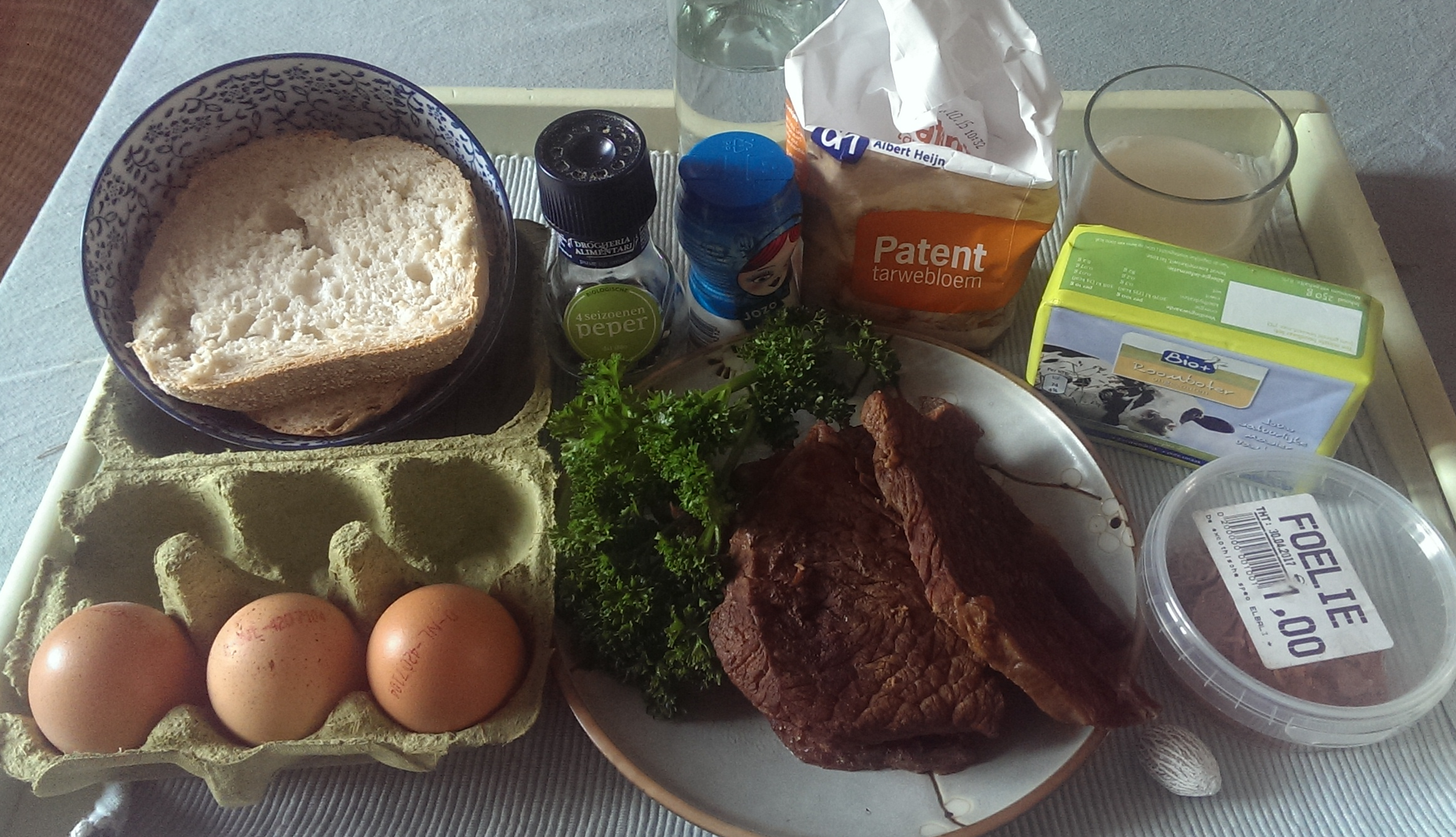 Snijd het gare vlees en de peterselie in kleine stukjes en meng door elkaar. Snijd de korstjes van het brood en week de sneetjes in de melk. Klop de dooiers met een beetje water.