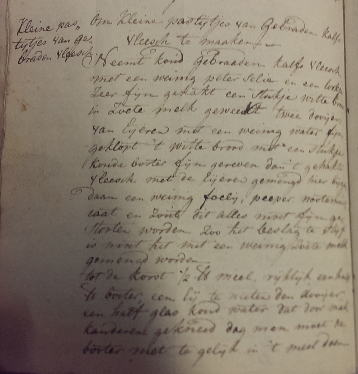 Dan het deeg. Zoals ik het lees staat er in het recept een ½ pond meel en een half pond boter. Dat wordt natuurlijk nooit fatsoenlijk deeg. Van de boter weet ik zeker dat er een half pond staat, maar misschien staat er bij bloem wel 12, 1 1/2 of 2. Ik kan het niet goed lezen. Daarom heb ik net zo veel boter door de bloem gedaan tot ik leuk deeg kreeg. De aanwijzingen waren namelijk als volgt: