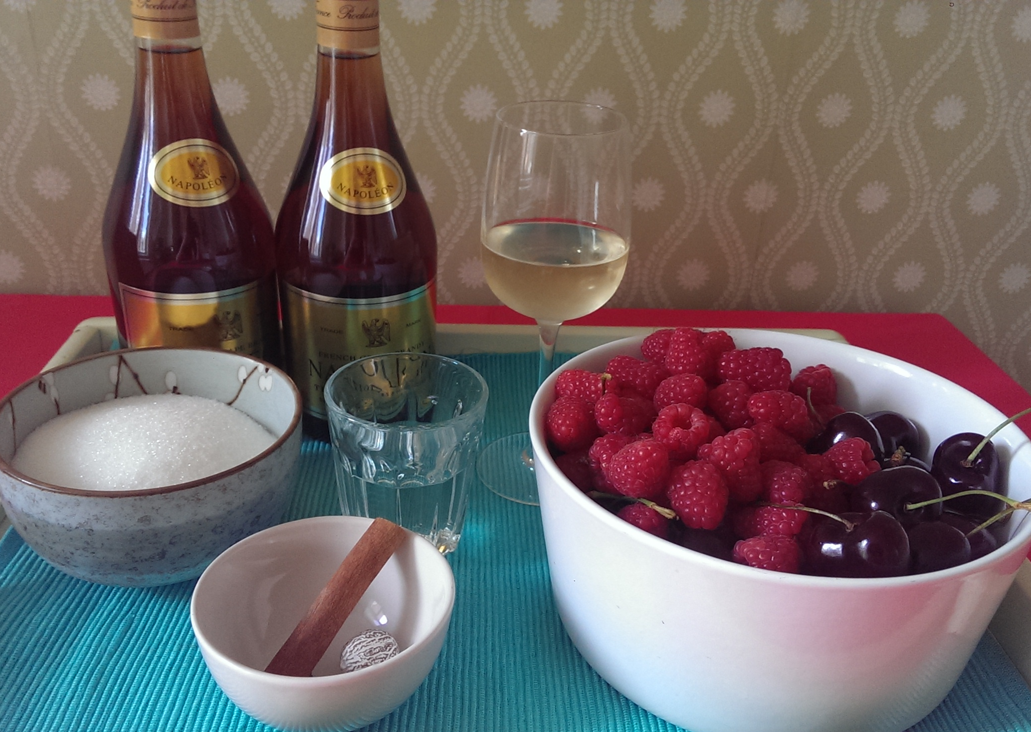 Ratafia is een alcoholische drank die niet erg bekend is. Ze wordt gemaakt door alcohol, kruiden en suiker toe te voegen aan druivensap dat net begint te gisten. Maar ander fruit kan ook. Uw Archiefkok heeft recepten gevonden voor Ratafia van sinaasappel, van perzikpitten, van morellen en van kweeperen. Voor de versie van Catharina van Staveren heeft u kersen (het liefst krieken en morellen, maar gewone kersen kan ook) en frambozen nodig.