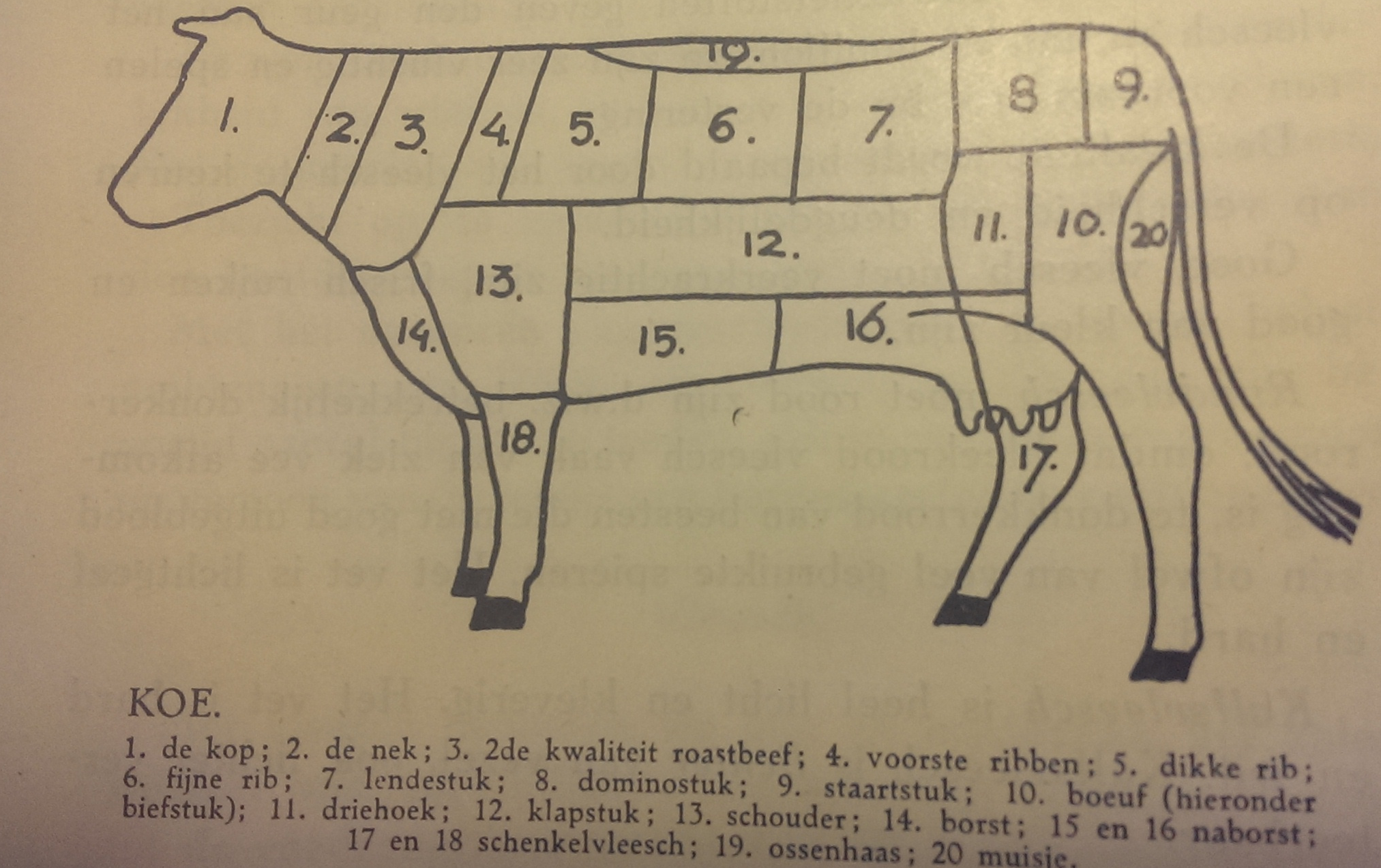 In ieder goed (niet vegetarisch) kookboek staan dierenplaatjes . Eenvoudige tekeningen van koeien en varkens, in vakjes verdeeld met een cijfer in ieder vakje. Die cijfers corresponderen niet met een kleur zodat u van die koe een Ravensburger rund kunt maken, maar om de delen die u kunt eten te benoemen.