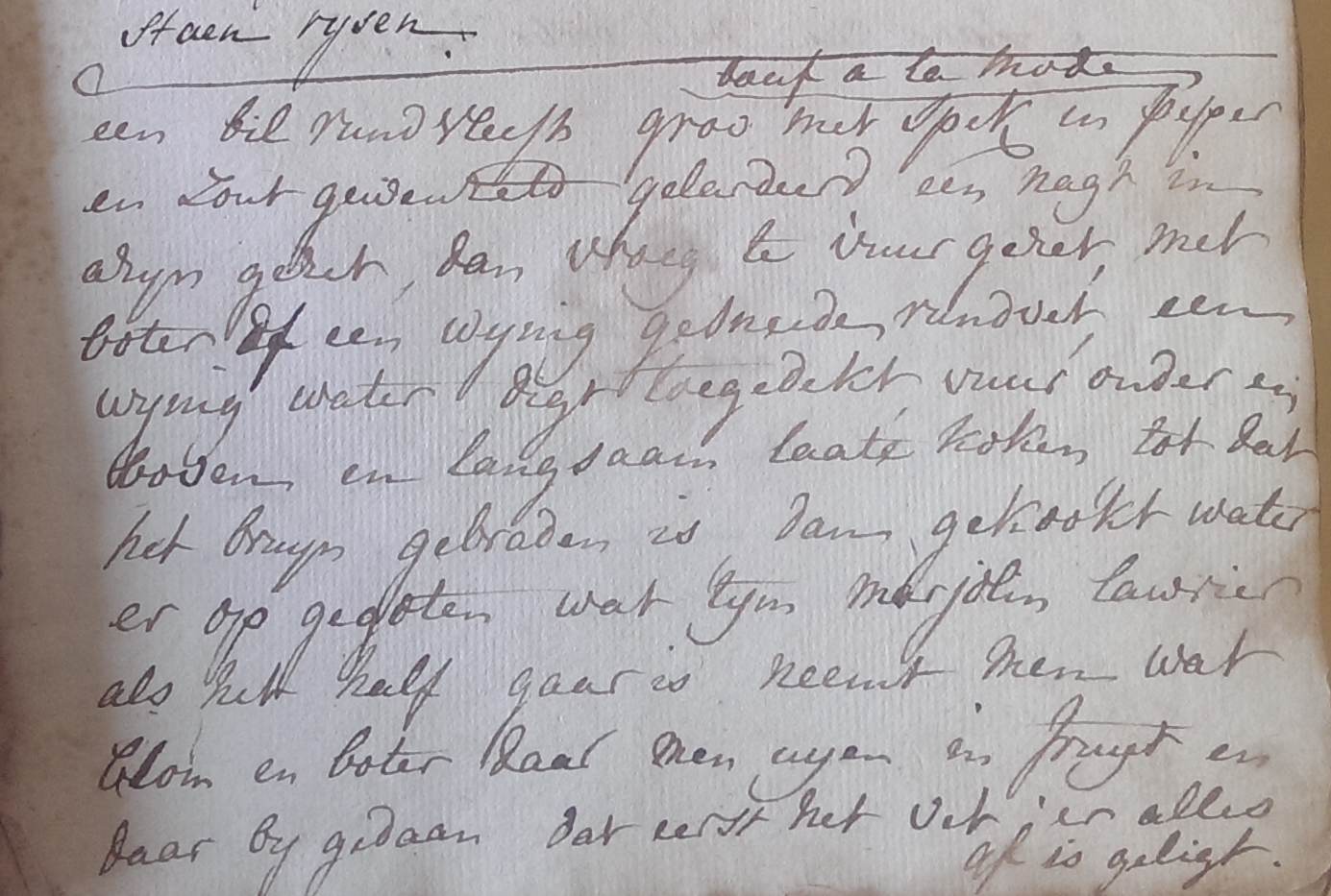Dan vroeg te vuur gezet met boter of een wijnig gesneeden rundvet, een wijnig water, digt toegedekt, vuur onder en boven en langsaam laate koken tot het bruijn gebraden is