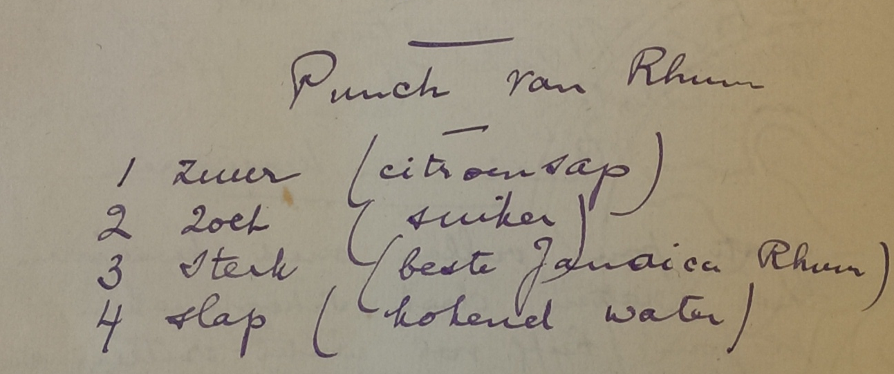 En goede cocktail, pardon punch, staat of valt bij de verhoudingen. Daarom staan er bij dit recept ook geen hoeveelheden, maar delen. Op elk deel zuur (citroensap) neemt u 2 delen zoet (suiker), 3 delen sterk (de beste Jamaicaanse rum) en 4 delen slap (kokend water).