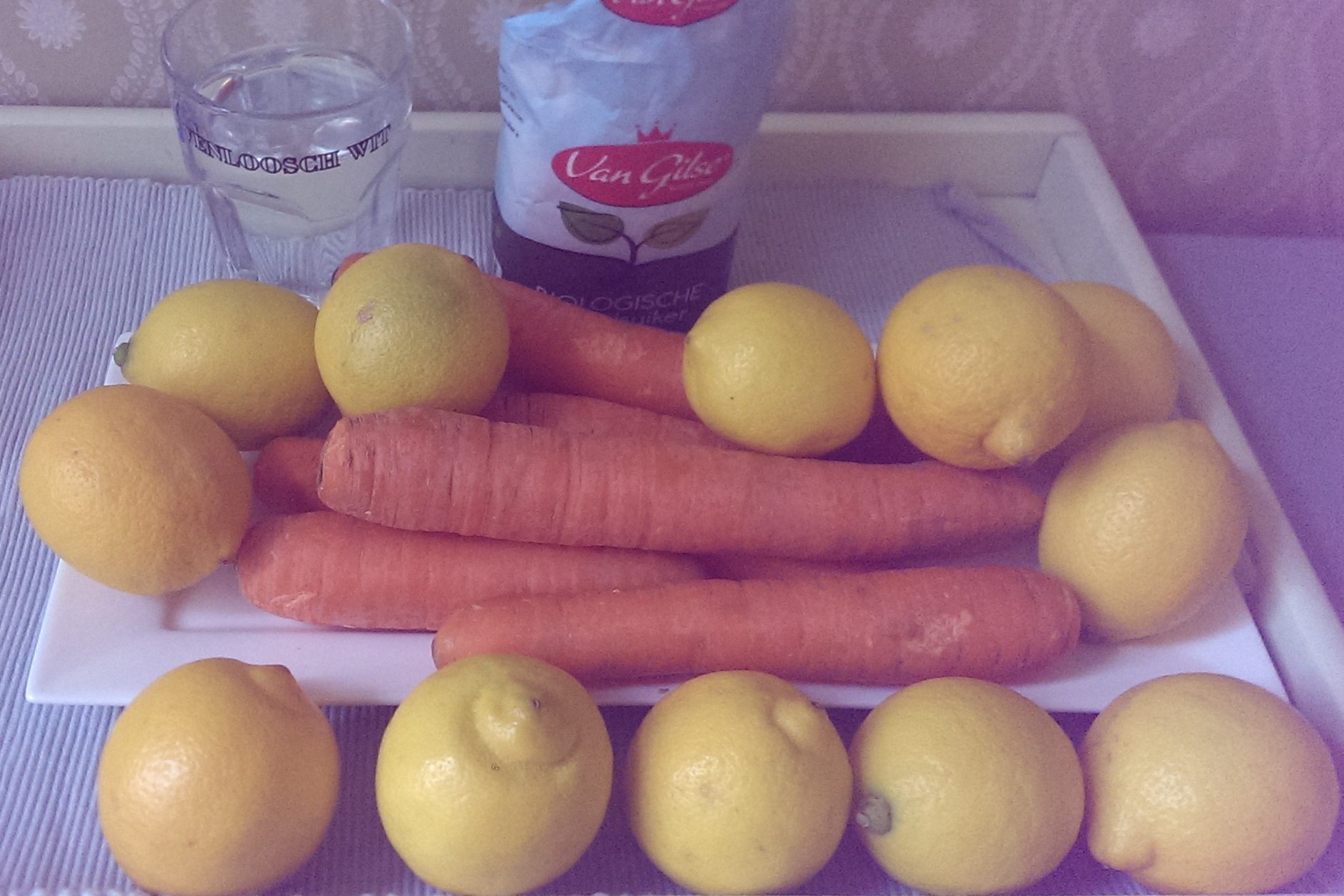 Rasp de schil van de citroenen en pers ze uit. Rasp vervolgens de wortels. Volgens het recept alleen de buitenkant, wat doet vermoeden dat de harde binnenkant van de Hoornsche wortel niet goed eetbaar was. Gelukkig is dat met de hedendaagse peen anders en kunt u die in zijn geheel door de keukenmachine duwen.