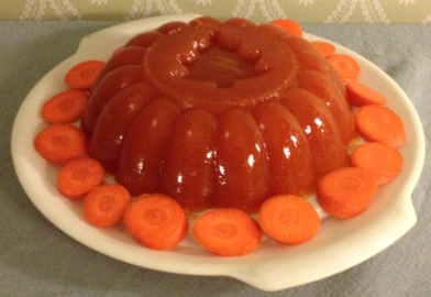 De gelatine deed zijn werk en wat er uiteindelijk uit de puddingvorm kwam, zou op geen enkele vroeg negentiende-eeuwse dinertafel hebben misstaan. Het was destijds de gewoonte om alle gerechten tegelijk op tafel te zetten in plaats van in gangen te serveren. Daarbij was het vooral belangrijk dat het eten er mooi uitzag. En dat doet deze oranje gelei zeker.