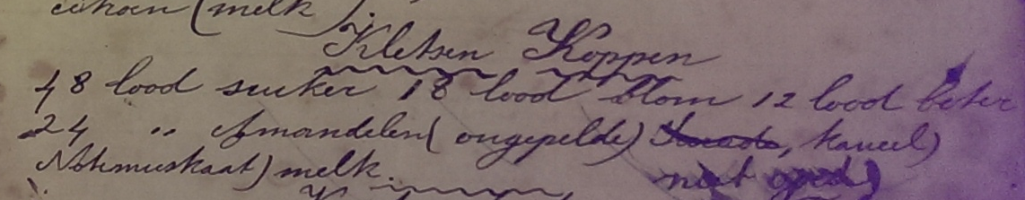 De nootmuskaat is een vreemd eend in de bijt. Deze specerij heb ik nog nooit in een recept voor kletskoppen aangetroffen. Reeser hield blijkbaar van variatie, al pakte dat niet altijd goed uit. In het recept is het ingrediënt sucade weer weggestreept met daaronder de tekst Niet Goed.