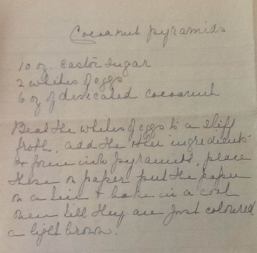 Het recept van vandaag is helaas niet voor een voorloper van de Bounty, maar voor cocoanut pyramids. Gezien de schrijfwijze en het onderwerp, dateert het recept waarschijnlijk uit Engeland en uit het einde van de negentiende eeuw. Dat was immers de tijd van de grote Engelse opgravingen in Egypte. De drie recepten die uw Archiefkok ervoor heeft, zijn ook allemaal in het Engels geschreven.