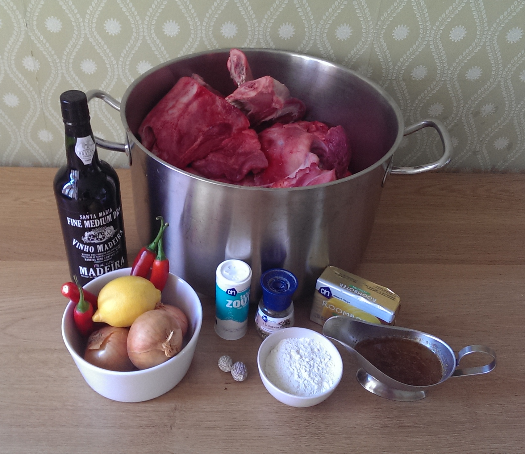 Voeg hieraan wat runderjus, de bouillon en het vlees toe. Breng de soep aan de kook en voeg na een half uurtje een flinke scheut Madeira toe. Na nog een half uur koken kan de soep op tafel. Serveer de rest van de Madeira erbij zodat iedereen die wil nog een scheutje in de soep kan doen.