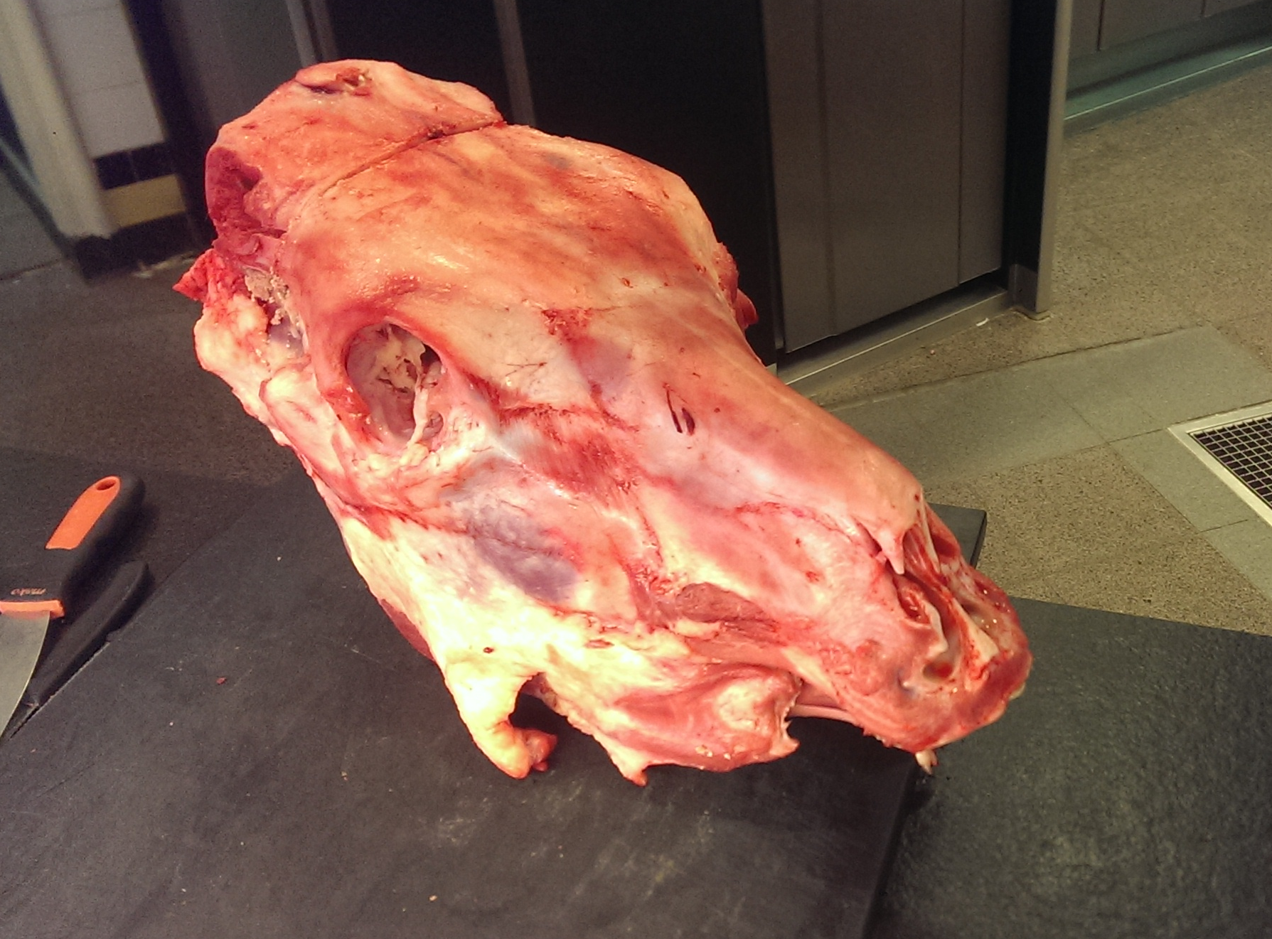 Trek het vlees van de botten. Niet bij nadenken, gewoon poeren in die oogkassen. De vetste delen kunt u weggooien, de rest in kleine stukjes snijden. Proef vooral even tussendoor. Het vlees, en dan vooral van de wangen, is zalig zacht. De schedel kunt u goed schoonmaken en aan de muur hangen of bij het vuil zetten. Pak deze dan wel zo in dat u uw vuilnisman geen hartverzakking bezorgt.