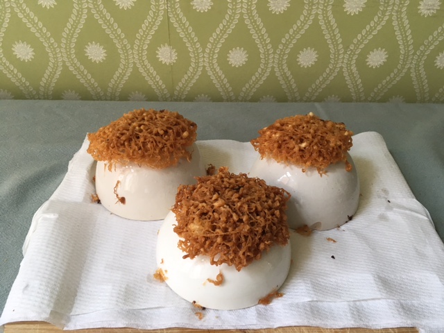 Nadat ik ook in het Zeeuws en in het Gelders archief een recept voor deze koeken had gevonden (volgens welke je de koeken ook in boter mocht bakken), besloot ik er eens wat dieper in te duiken. Veel informatie is er echter niet. De drabbelkoek lijkt een specialiteit te zijn uit Sneek en wordt zo genoemd omdat het deeg met een trechter in het hete vet wordt ‘gedrabbeld’. Dat betekent dat je de trechter moet bewegen terwijl het deeg eruit loopt, zodat de koek zich opbouwt uit verschillende dunne strengetjes deeg. Ze zouden in Sneek al sinds 1700 worden gebakken  en de Sneeker boterdrabbelkoekenfabriek De Friese Sjees mag zich zelfs al sinds 1880 hofleverancier noemen.