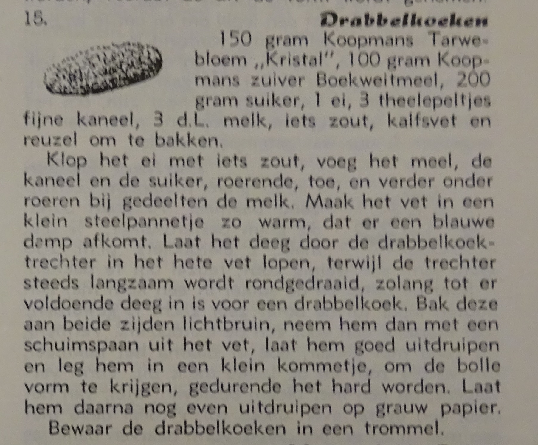 In het archief van Koopmans, dat zich bij Tresoar bevindt, zijn drie recepten voor drabbelkoek bewaard gebleven. De oudste versie uit 1958 schrijft voor dat je de koeken in reuzel en kalfsvet bakt. Van latere versies mag dat ook in boter of slaolie. De ingrediënten en hoeveelheden bleven door de jaren echter hetzelfde en dat moet toch iets zeggen over de kwaliteit van dit recept.
