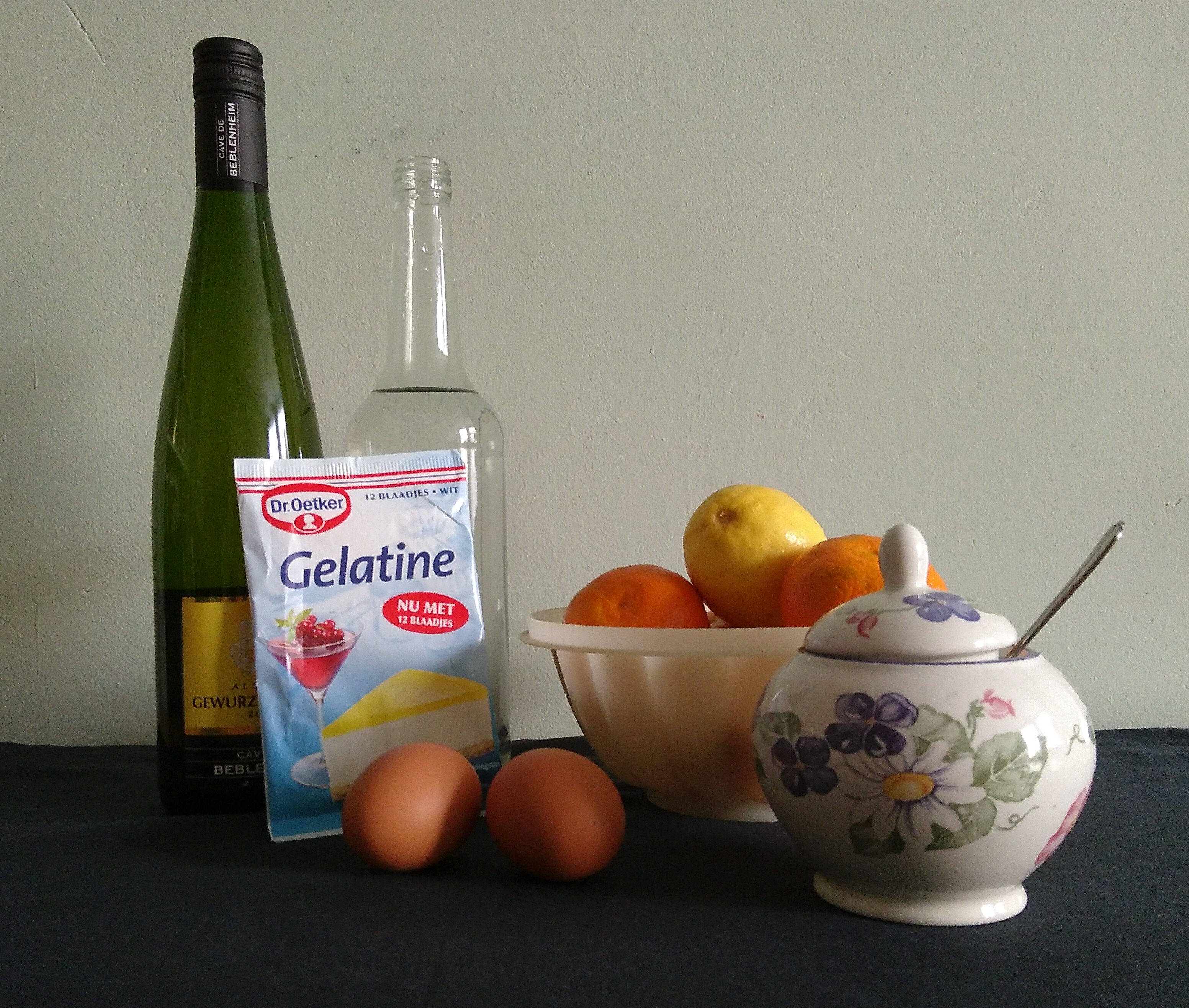 Zet een pan op laag vuur en verwarm daarin het water (nog niet de wijn!), de suiker, het citroensap, de eiwitten en de uitgeknepen blaadjes gelatine. Het nut van die eiwitten is uw Archiefkok niet helemaal duidelijk, al hebben deze de bijzondere eigenschap onzuiverheden uit vet te kunnen filteren. Wellicht zijn ze bedoeld om de gelei helder te maken. Dat is echter niet gelukt.