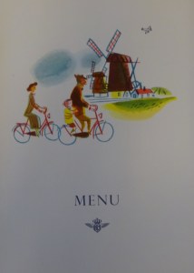 De binnenkant van de menukaarten is al net zo mooi. In de eerste naoorlogse jaren kreeg de gast nog een eenvoudige menukaart per maaltijd. Later kreeg men er eentje voor de hele reis, duidelijk bedoeld om te bewaren als souvenir. Ons geeft dat de mogelijkheid om niet alleen te zien wat er gegeten werd, maar ook welke routes werden gevlogen en waar de tussenlandingen werden gemaakt. Helaas voor ons, zijn ze echter niet gedateerd.