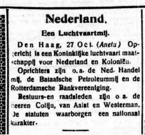Volgend jaar is het precies honderd jaar geleden dat in Den Haag de Koninklijke Luchtvaart Maatschappij voor Nederland en Koloniën werd opgericht. Het geld daarvoor werd bijeengebracht door acht Nederlandse ondernemers met een vooruitziende blik.