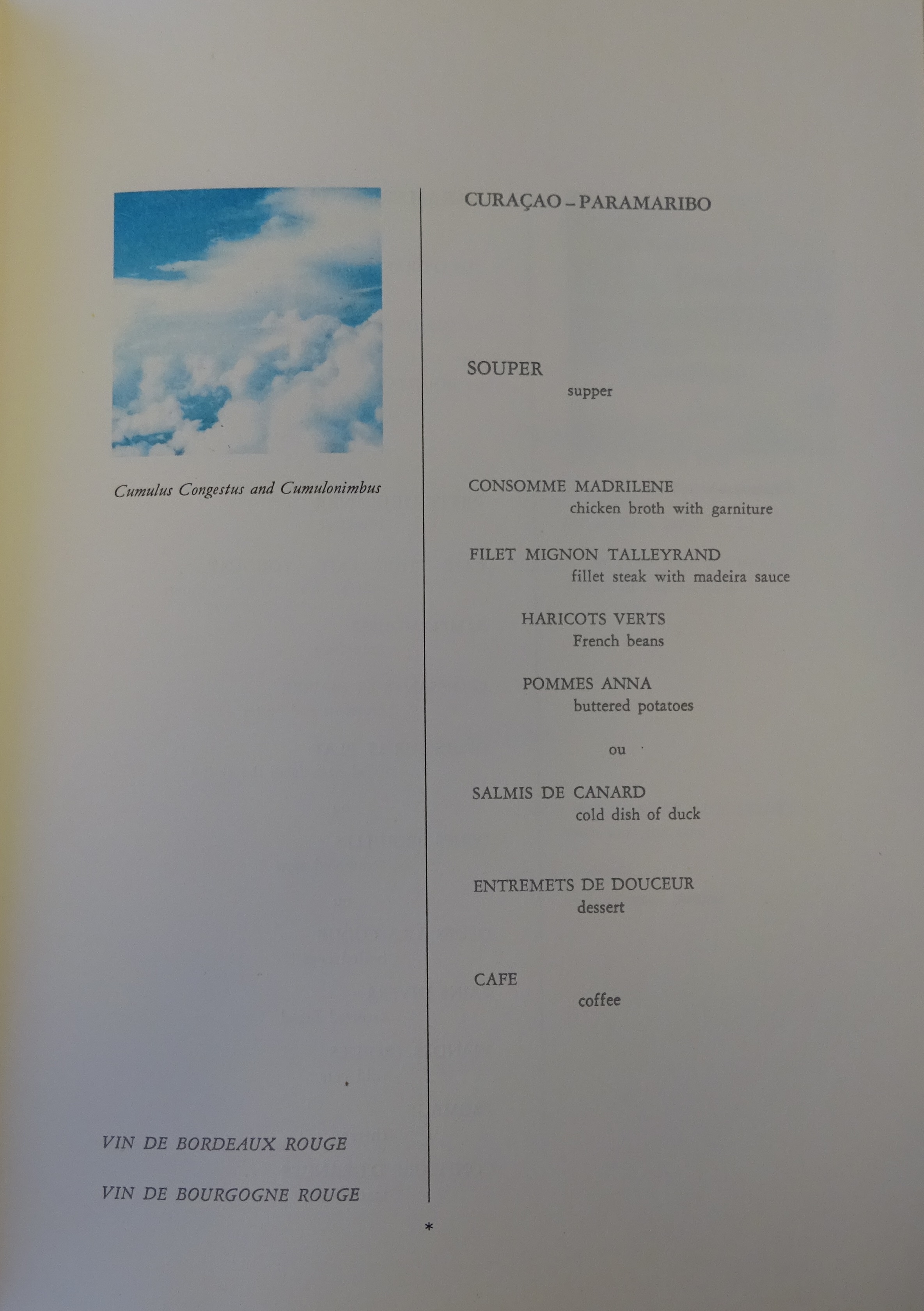 Na Paramaribo, waar ongetwijfeld nog meer passagiers voor Amsterdam instapten, werden non-alcoholische dranken en bouillon geserveerd en was het bedtijd. Boven de oceaan kreeg men een ontbijtje en was er keuze uit snacks, broodjes en allerlei zoetigheden.