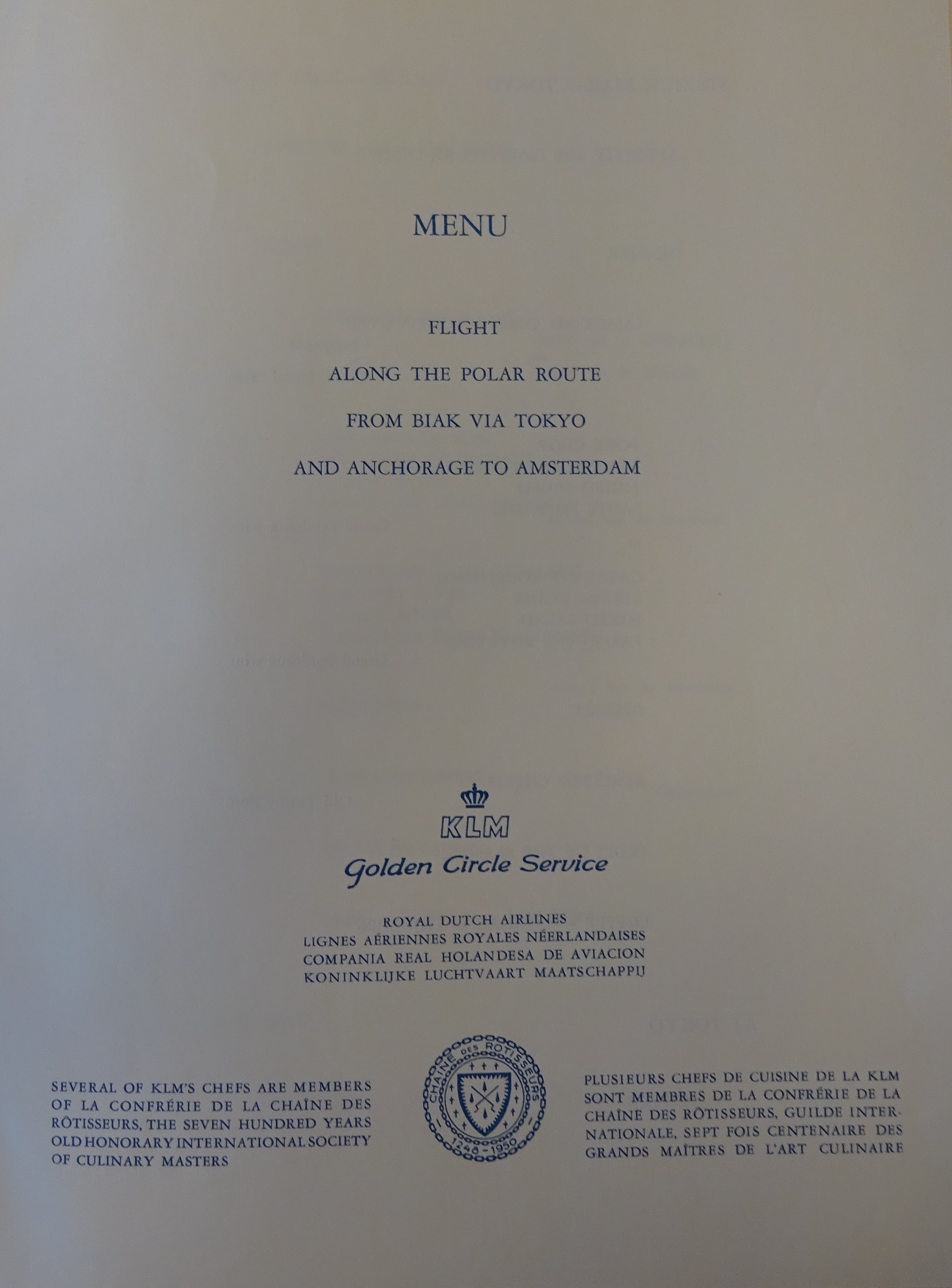 Deze menukaart van de Polar-Express is van een vlucht van Biak (eiland in de Indonesische provincie Papoea) via Tokio en Anchorage (Alaska) naar Amsterdam. Voor de passagiers begon de reis meteen goed. Zij kregen meteen een aperitief geserveerd mét garnituur. Daarna kwam de champagne met hors-d’oeuvres, gevolgd door karbonade of tournedos met verschillende groenten, een salade en gebakken aardappelen. Daarna volgden een dessert, port met kaas en daarna nog vers fruit.