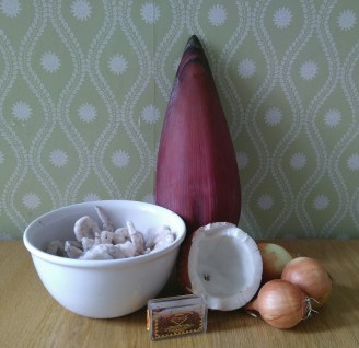 Het vinden van zo’n bananenbloem is in Nederland niet simpel. Ze zijn bijzonder kwetsbaar en rotten snel weg. Geen wonder dus dat ze bijna nergens te koop zijn, zelfs niet in de oosterse supermarkten van Den Haag die doorgaans alles verkopen wat een Archiefkok maar nodig kan hebben. Met behulp van vele lieve Twitteraars, kwam ik echter op het spoor van een supermarkt in het Haagse Chinatown. Een wat verwarrend telefoontje later had ik ongeveer begrepen dat zij elke vrijdag  verse bananenbloemen binnenkrijgen.
