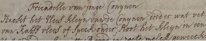Dat op de portemonnee werd gelet, blijkt ook uit de recepten die in het familiearchief te vinden zijn. Tussen de losse briefjes met aanwijzingen voor het bereiden van pasteien, koekjes, hartversterkers en middelen tegen allerlei kwalen, bevinden zich twee recepten voor fricadelle van jonge conijnen én een recept voor fricadelle van haas. Voor dat laatste recept waarschuwt de schrijfster ons: goed, maar kostbaar! Bij de Van Schinnes zal er dus vaker konijn op het menu hebben gestaan.
