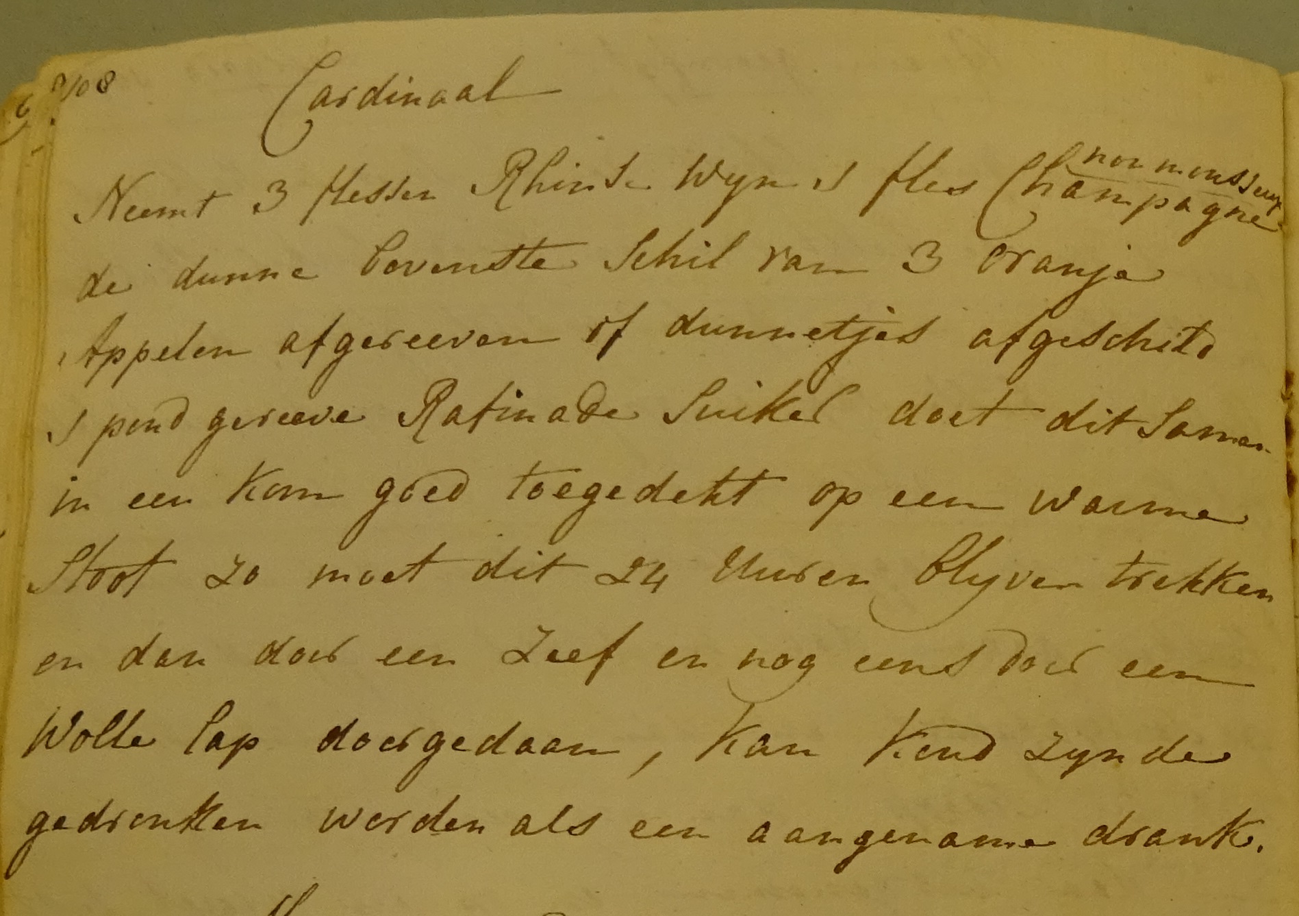 In haar zoektocht in de Nederlandse archieven, die tot nu al bijna 10.000 recepten opleverde, is uw Archiefkok al die varianten uit Engeland nooit tegengekomen. Alleen de bisschop dook af en toe op. Tot ik in het Gelders Archief op de kookboekjes van Sophia Taets van Amerongen en haar moeder Catharina Mossel stuitte en daar deze kardinaal vond. Catharina werd geboren in India, waar destijds ook veel Engelsen vertoefden. Misschien kwam het recept zo in de familie? Maar anders dan in Engeland, dronken zij hun cardinaal niet smoking hot. Ze adviseren ons hem koud te drinken.
